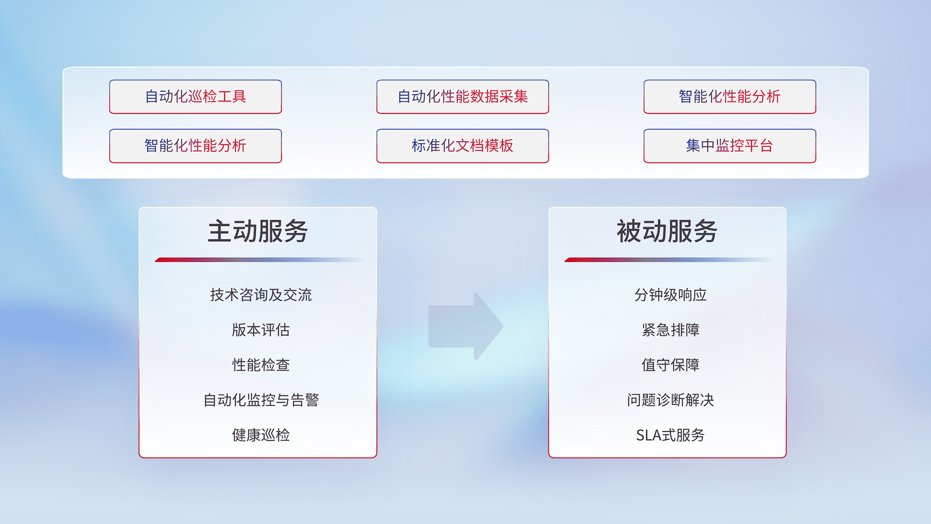 智能化工具和标准化文档,,保障服务质量,,,,提供主动服务(包含技术咨询、、、、版本评估、、性能检查、、、自动化监控与告警、、健康巡检)和被动服务包含(分钟级响应、、紧急排障、、值守保障、、问题诊断解决、、、SLA服务)。。。